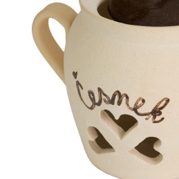 Možnost glazury: Hrnec se světlou terakotou s hnědě glazovanými doplňky.