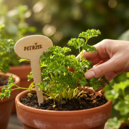 Jmenovka k bylinkám - petrželka Objevte kouzlo ručně vyráběných zápichů k bylinkám, které dodají vaší zahradě nebo truhlíku osobitý šarm. Každý kus je originál, pečlivě vytvořený s láskou a precizností, což zaručuje jedinečnost a kvalitu. Jmenovky jsou nejen praktické, ale také esteticky příjemné. Vlastnosti: Trvanlivý materiál: Kvalitní keramika...