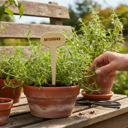 Jmenovka k bylinkám - saturejka Objevte kouzlo ručně vyráběných zápichů k bylinkám, které dodají vaší zahradě nebo truhlíku osobitý šarm. Každý kus je originál, pečlivě vytvořený s láskou a precizností, což zaručuje jedinečnost a kvalitu. Jmenovky jsou nejen praktické, ale také esteticky příjemné. Vlastnosti: Trvanlivý materiál: Kvalitní keramika...